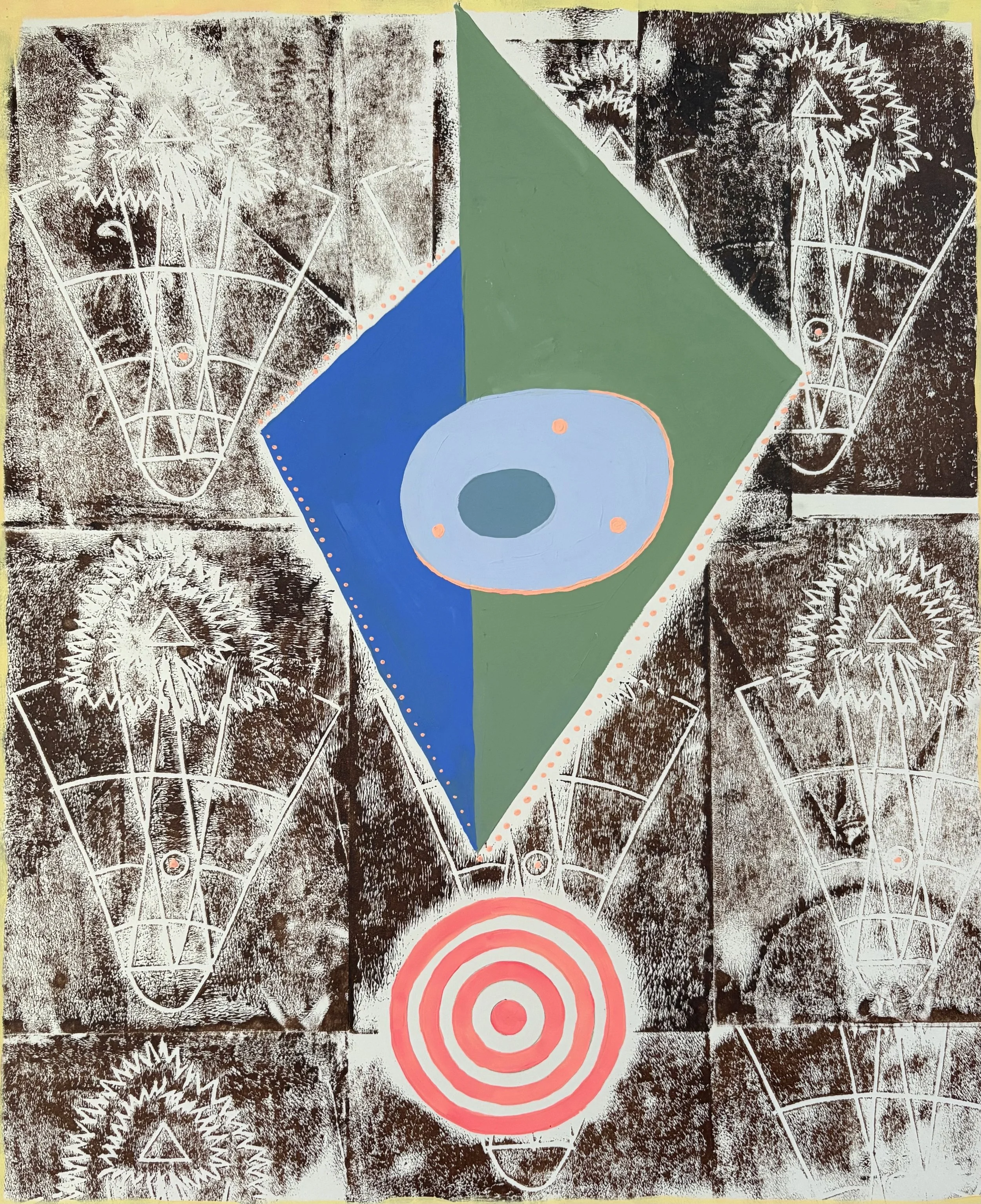 Hand-burnished print with gouache painting
